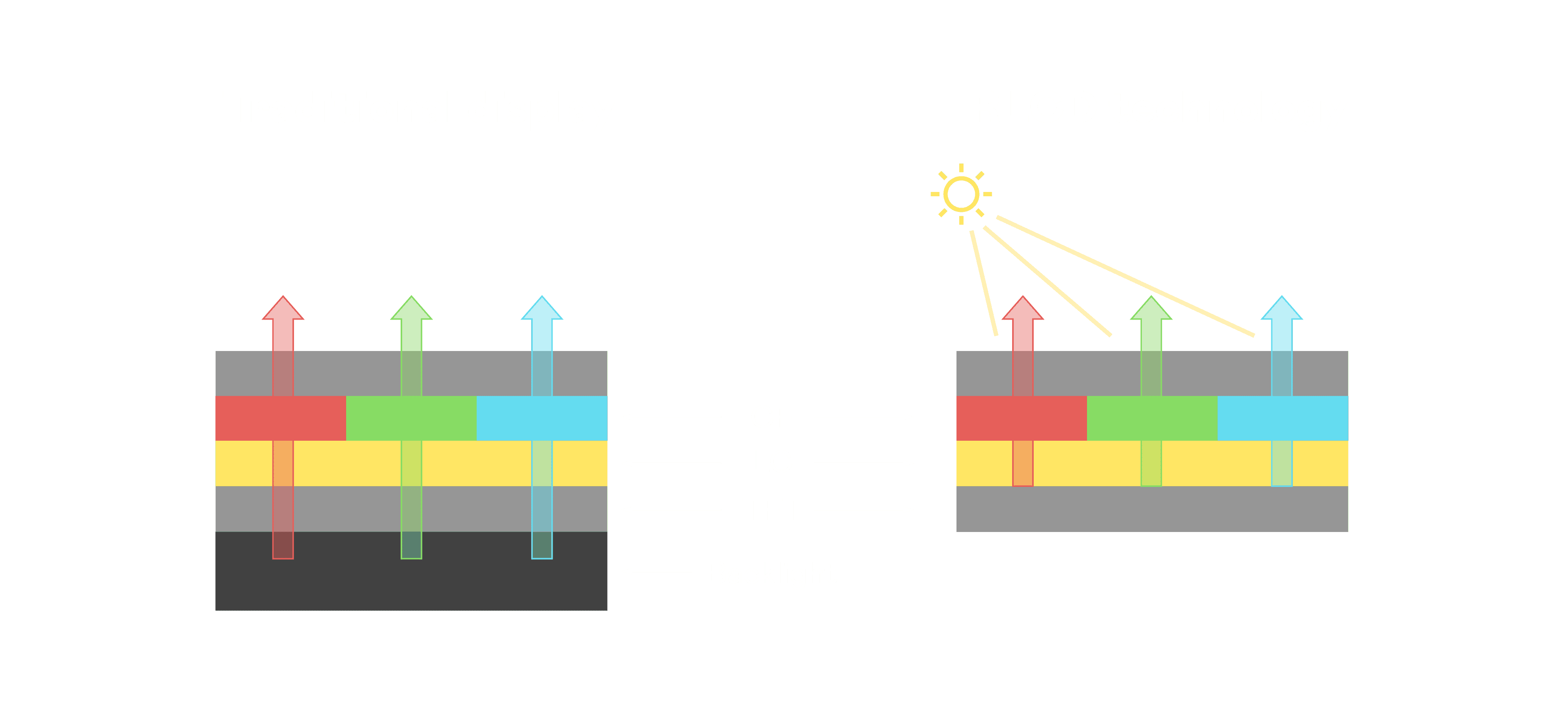 与传统需搭配背光单元的液晶显示相比,,,,反射式液晶技术不仅更省电、、、更轻薄,,且即便在艳阳下仍能清晰显示。。。此外,,,,少了背光单元,,,也大幅降低了 LED 蓝光伤害眼睛的疑虑。。